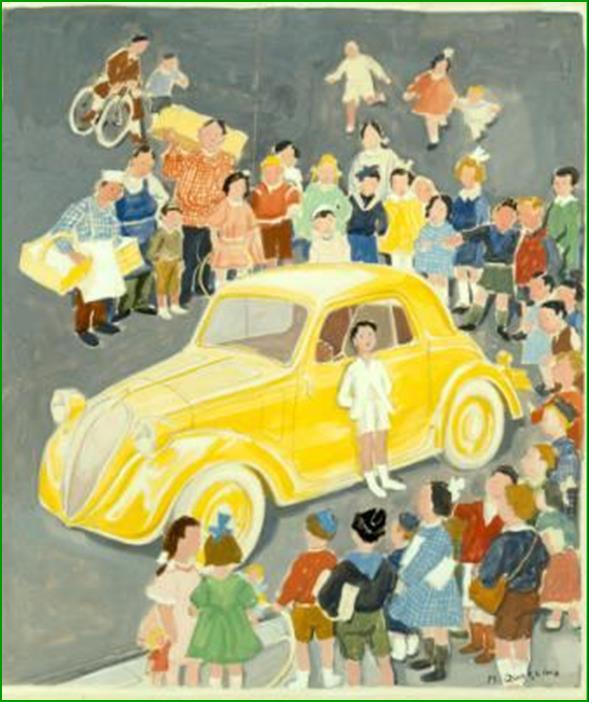 In questo manifesto e’ rappresentata la realta’ quotidiana, i bambini il panettiere gli operai, tutti sono intenti a guardare la vetturetta con ammirazione, siamo in pieno ventennio ed i bambini sono raffiguranti in tenuta da Piccolo Balilla e le bambine da Piccola Italiana. L’opera non verra’ rappresentata su riviste ma rimarra’ a livello di bozzetto studio. |